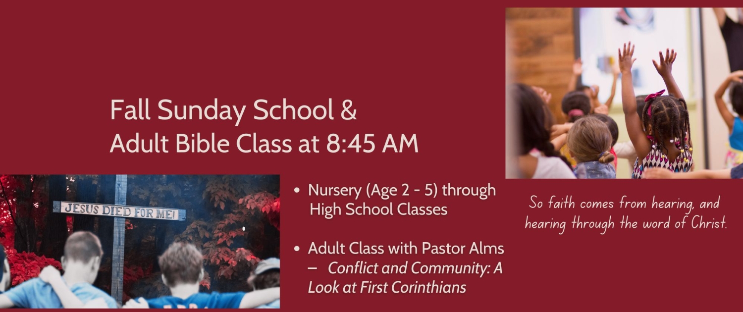 Sunday School for adults, youth and children* is at 8:45 AM, followed by Worship at 10:00 AM and coffee fellowship following Worship.